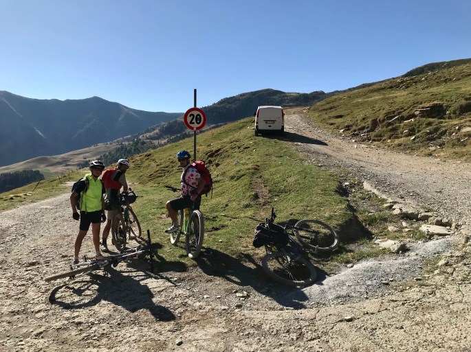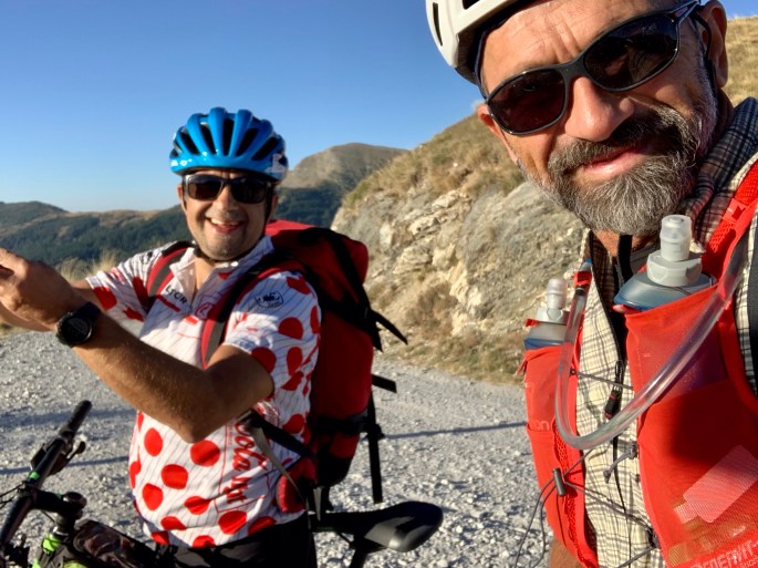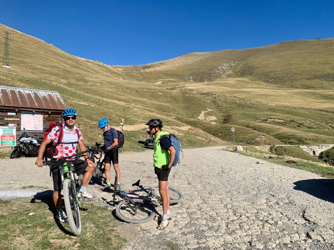 Avviso la signora al bar del rifugio che siamo arrivati. Restiamo fuori, il sole delle 15.30 è ancora caldo. Panino, acqua, foto e allungamento della schiena per me. Ci riposiamo un po’. Poi guardiamo il freno della mia bici. Lo spirito dei miei gregari fa sì che uno di loro pensi alle viti dei portaborracce: sono perfette, M5 mi sembra. Ne svitiamo 4 e le avvitiamo per tenere il disco. Perfetto. Meglio che nuovo. Penso anche più affidabile. Sono più tranquillo per le discese della seconda tappa.