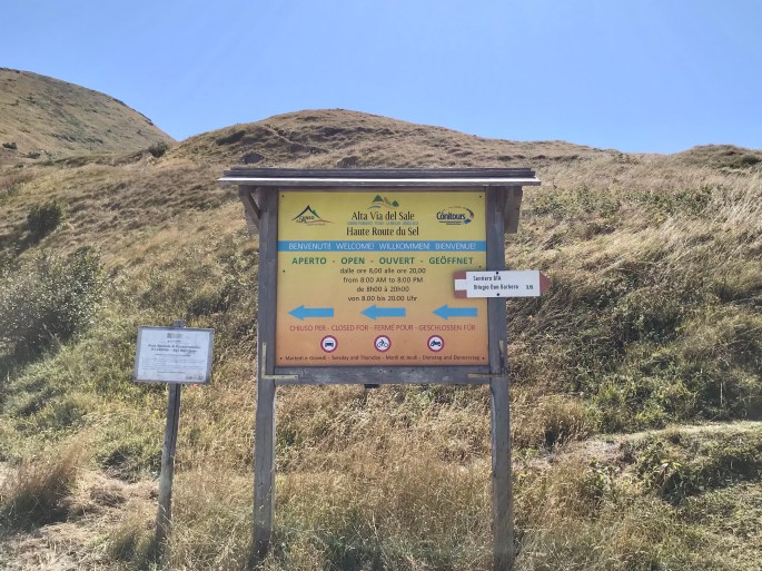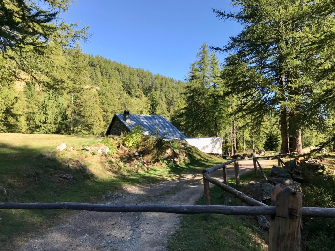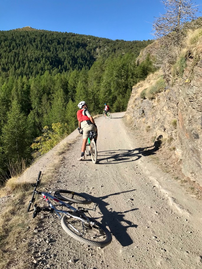 Io sempre ultimo, pedalo guardando il paesaggio. Siamo prevalentemente in discesa, il fresco della mattina è piacevole. Il cielo è sereno, bellissimo. Questo versante è più verde di quello da Limone. Incontriamo mucche, cani pastori e un malgaro. Si passa nei boschi, e fa piacere visto il sole caldo nel cielo. Ci fermiamo un attimo alla casetta della Stazione d’ingresso all’Alta via, io ho i biglietti di tutti e 4 nello zaino, per eventuale controllo del pedaggio di 1 euro ciascuno pagato alla stazione d’ingresso precedente, il giorno prima.