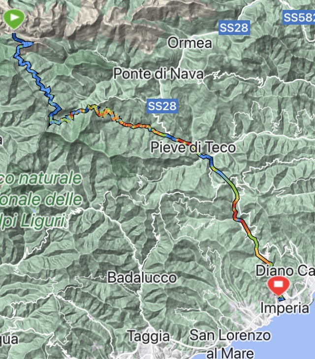 Cominciamo a pensare alla tappa della domenica: passare da Triora facendo il passo del Tanarello e poi andare ad Arma di Taggia ci sembra un po’ troppo. Guardiamo una carta della zona: optiamo per Monesi, Mendatica e poi Imperia. I chilometri sono circa gli stessi, ma evitiamo il passo. Triora bye bye.